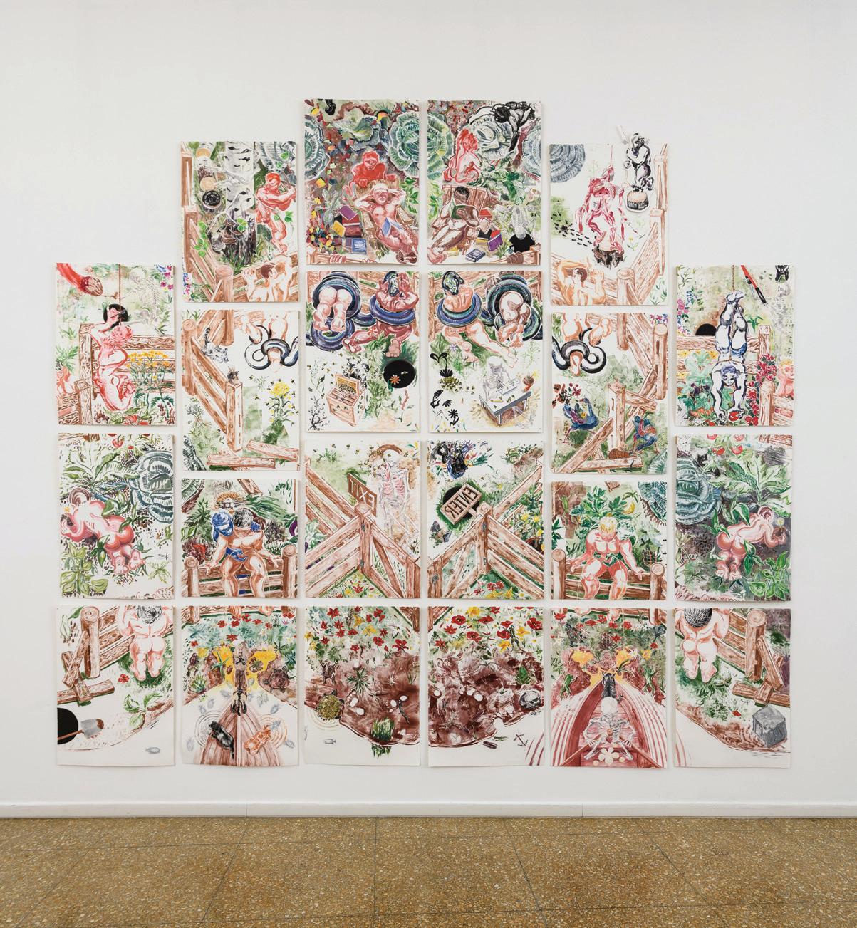 as they move from comic to tragic scenes. Through free associations and a personal re-elaboration of significant forms drawn from Western art history—including, for instance, Michelangelo’s naked figures and the skeleton of the Virgin Mary inspired by a drawing by Raphael for The Deposition of the Baglioni Altarpiece—the work invites us to meditate on themes of queer sexuality, the AIDS crisis, abortion rights and ecology. The natural world visually and thematically unifies the composition, which unfolds on multiple sheets: the snake grapples and binds together the naked figures in their fight against AIDS; the bees sting the skeleton of the Virgin Mary after having sucked the nectar from the yellow silphium, a plant used as a contraceptive by Ancient Romans, while the same bees are artificially inseminated by a skeleton; finally, the amphibians flee from a pond that has been reduced to a urinal. In Stong’s works, we can see an incessant transformation of meanings, messages and symbols that, through the apparent quietude of a fantastical garden, ultimately leads us to a bitter reality