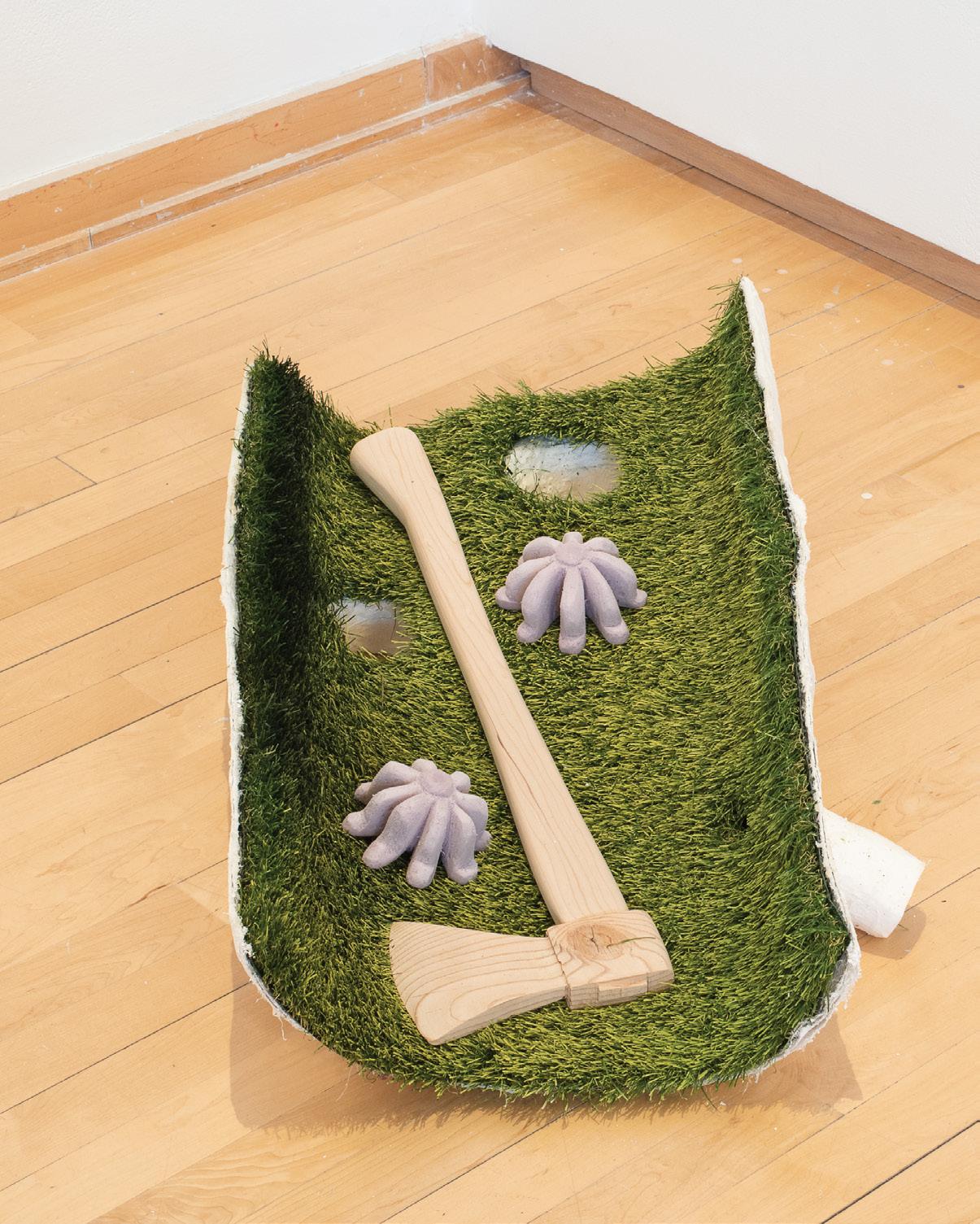 As with the dreamlike luminescence of the Styrofoam lamp, the innumerable small, fanned napkins are now a monumental foam sculpture. Its surreal nature is equaled by large wooden pieces of sushi grass painted green and pink, while a monochromatic painting of a single plate from the restaurant is displayed vertically.