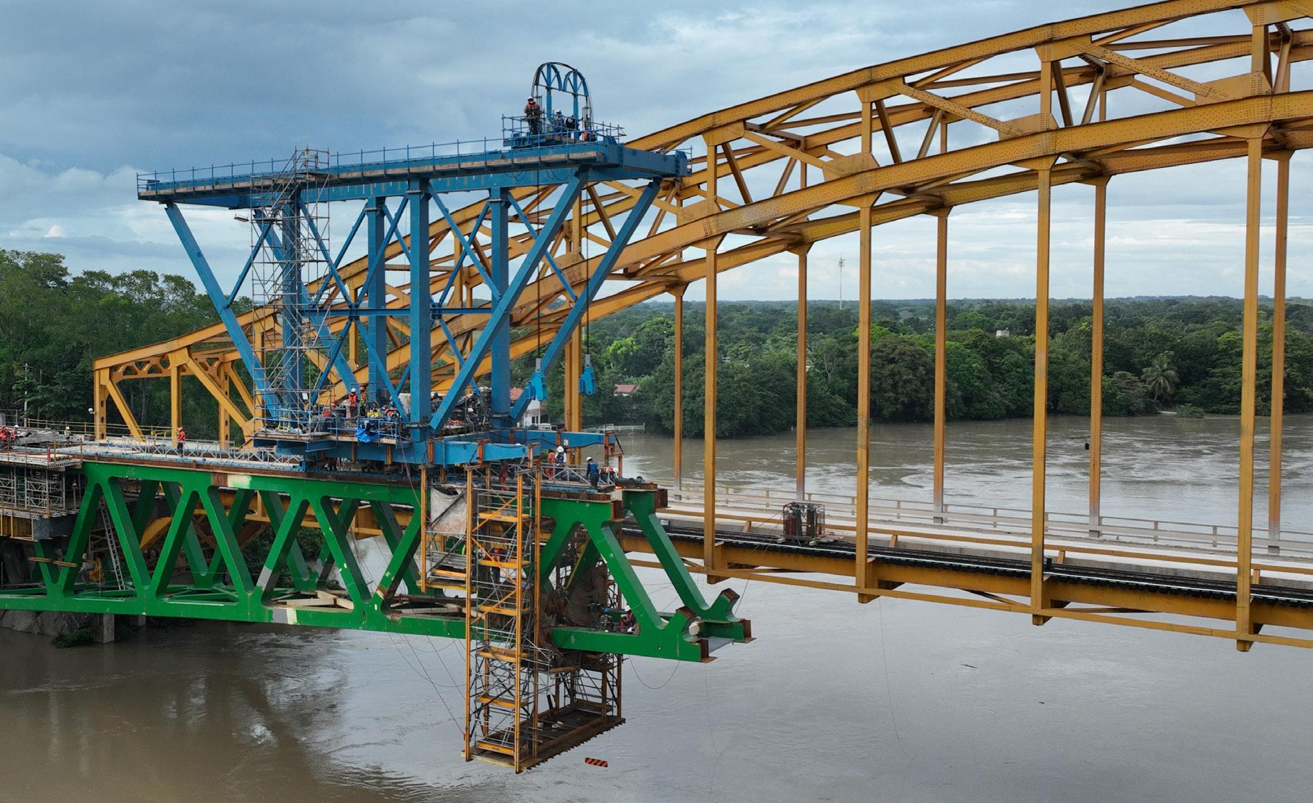 The new bridge, painted dark green to blend discreetly with its environs, is located upstream of the existing bridge. The railway crossing is barely visible from downstream, which is where the two bridges can most easily be seen, standing as icons to the Mayan Train’s esteemed past and bright future.
