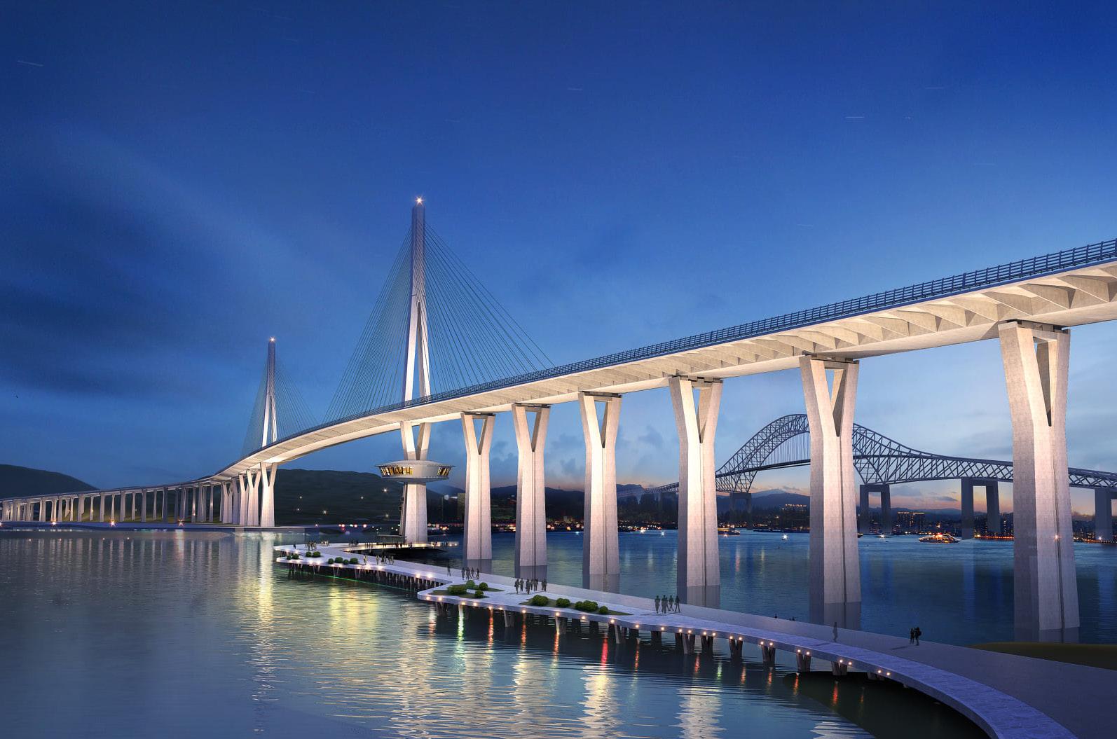 Scheduled for completion by the end of 2027, the bridge consists of a 520-metre-long north approach, a 790-metre-long, three-span cable-stayed bridge, and a 740-metre-long south approach. The bridge superstructure is continuous with only two expansion joints, one at each abutment, for reduced bridge maintenance.