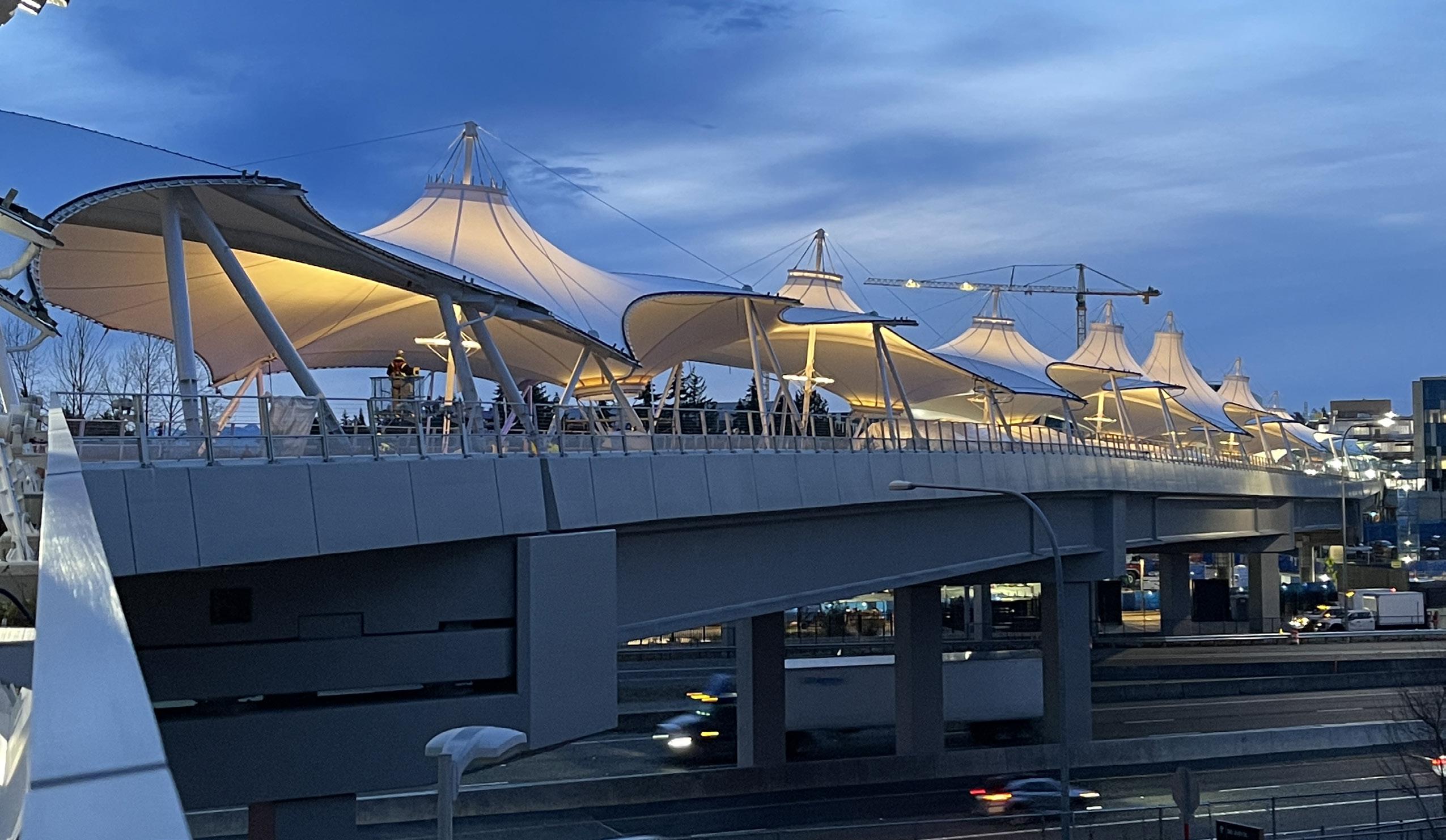 The luminous, undulating membrane roof is made of a polytetrafluoroethylene (PTFE)-coated glass fabric. The design features high points and downspouts that serve as water collection points to keep bridge users dry. LED lighting was incorporated into the fabric.