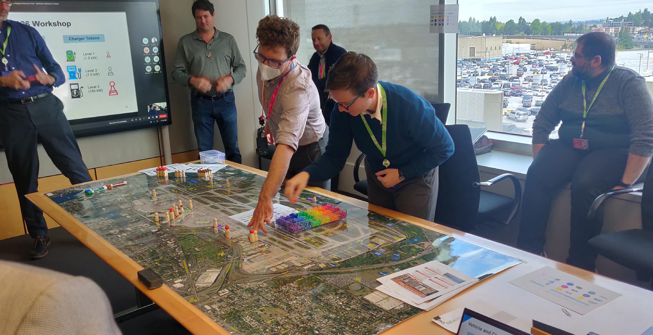 Port staff discuss vehicle charging sites at a hands-on workshop.