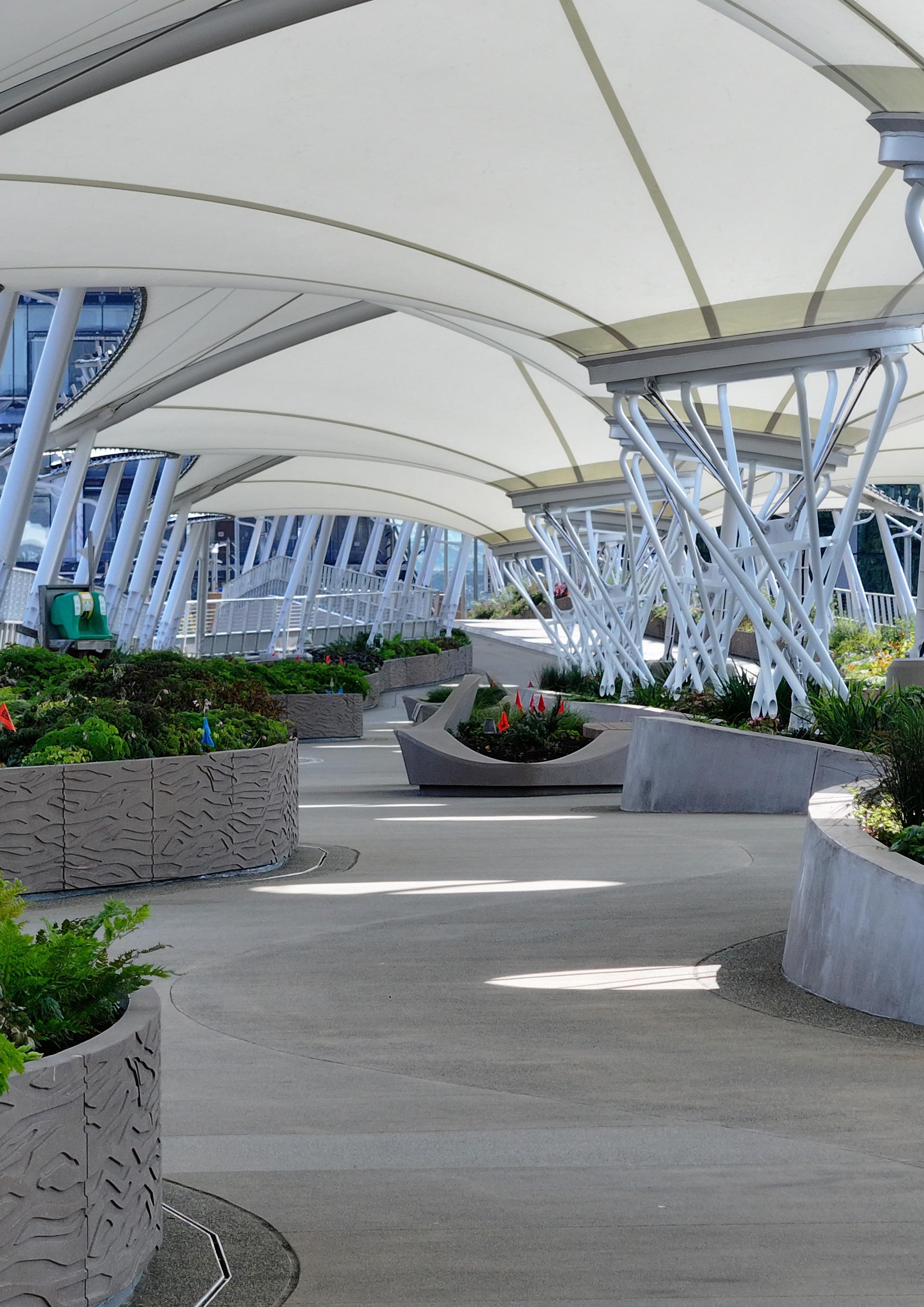 “We were charged with designing a unique enclosure that provides an elegant visual profile while protecting bridge users,” says Goldsmith. “The canopy not only offers coverage of the pedestrian and bike lanes, but it also creates special areas for “moments of repose,” where people can stop and chat while sheltered from the region’s rain-intensive climate.”