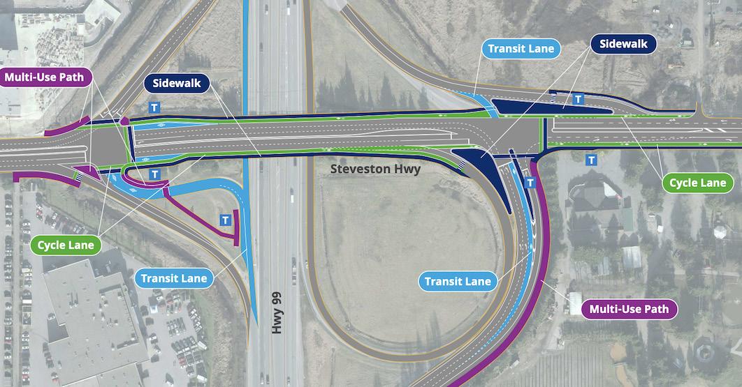 priority at intersections and a dedicated bus lane and in-lane bus stop on the northbound offramp. Additionally, there will be dedicated walking and bicycling pathways on both sides of the new Steveston Highway overpass across Highway 99.