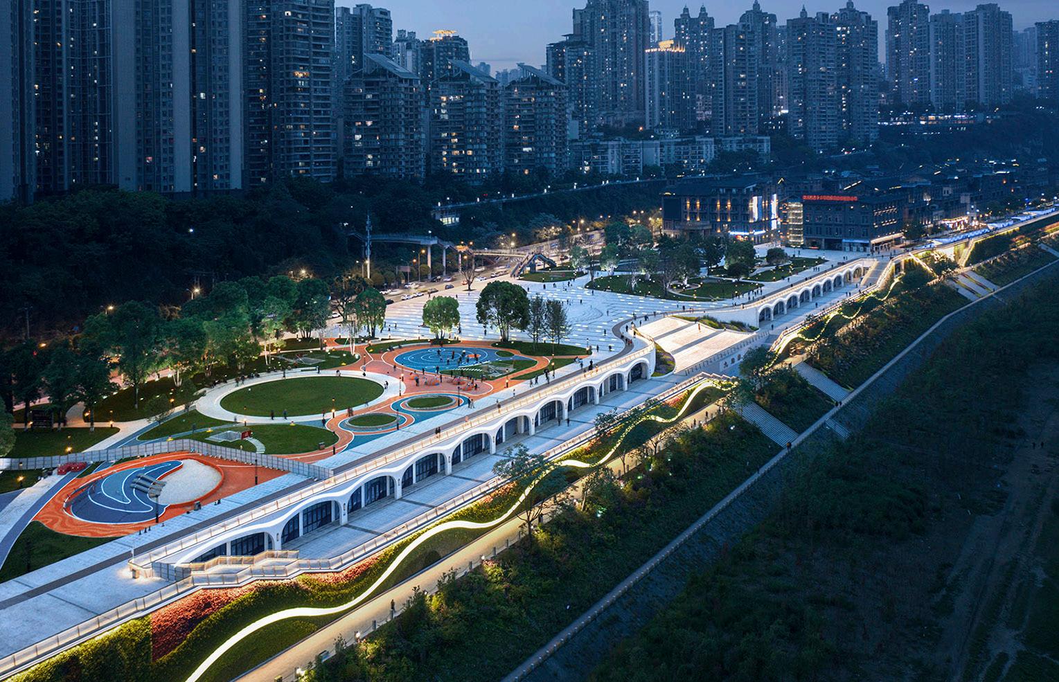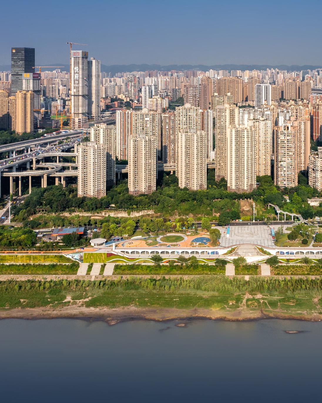 Kowloon Bund in the Jiulongpo District creates a resilient riverfront that uses “seasonal use” as the design concept. The long-term goal of the project is to restore and revitalize urban life back on the north bank of the Yangtze River. The project includes 1.8 kilometers of retaining walls and restored 26 hectares of land that fluctuate seasonally.