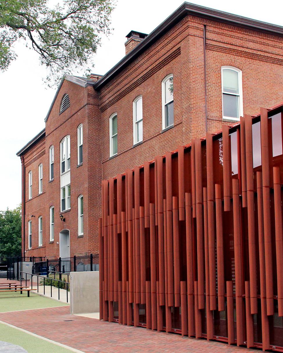 The renovation of the Hyde-Addison School, completed in 2019, upgraded and merged two century-old public facilities into a single, cohesive campus in DC’s Georgetown neighborhood. A brightly colored, 30,000-square-foot addition links the existing structures and provides a new gymnasium as well as other specialized areas. This LEED Gold-certified project was part of a major DC government modernization and stabilization effort, a multi-billion investment in the city’s K-12 schools.
