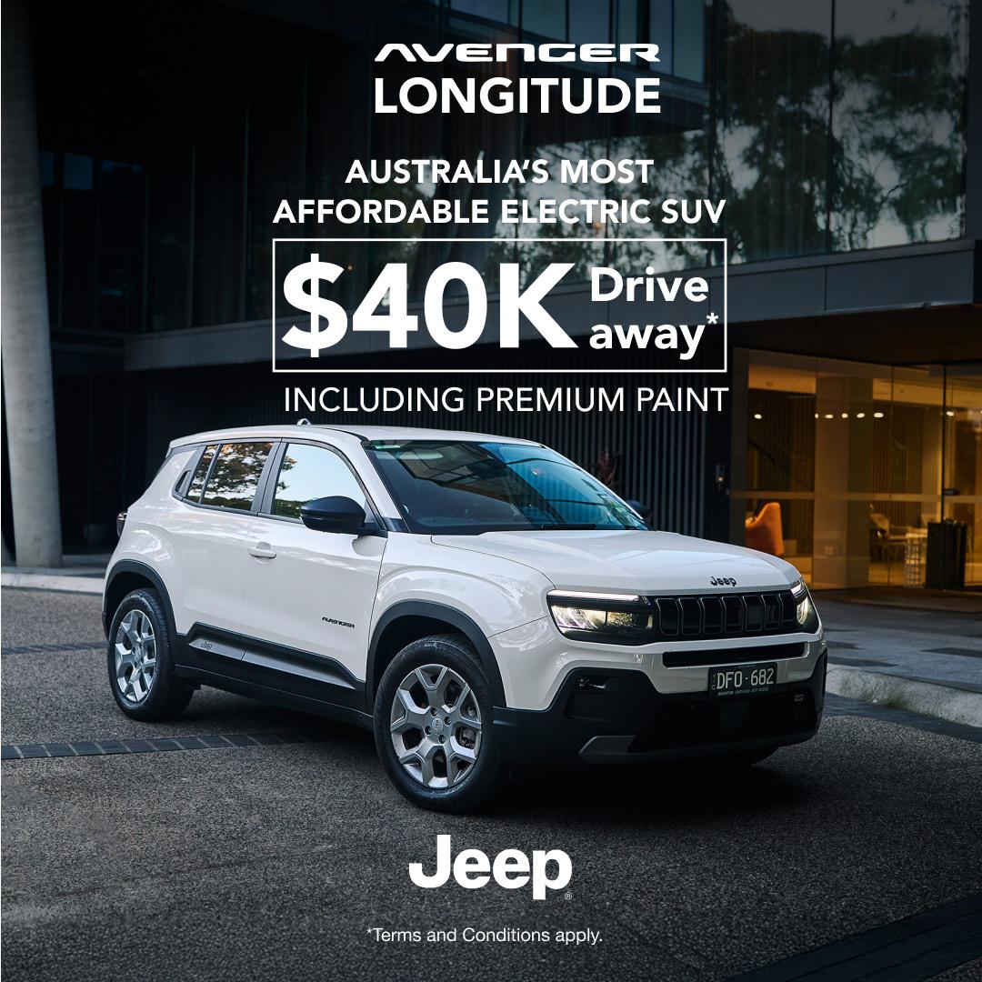 Say hello to all-electric freedom. Drive away in the Avenger Longitude for $40K Driveaway including premium paint.