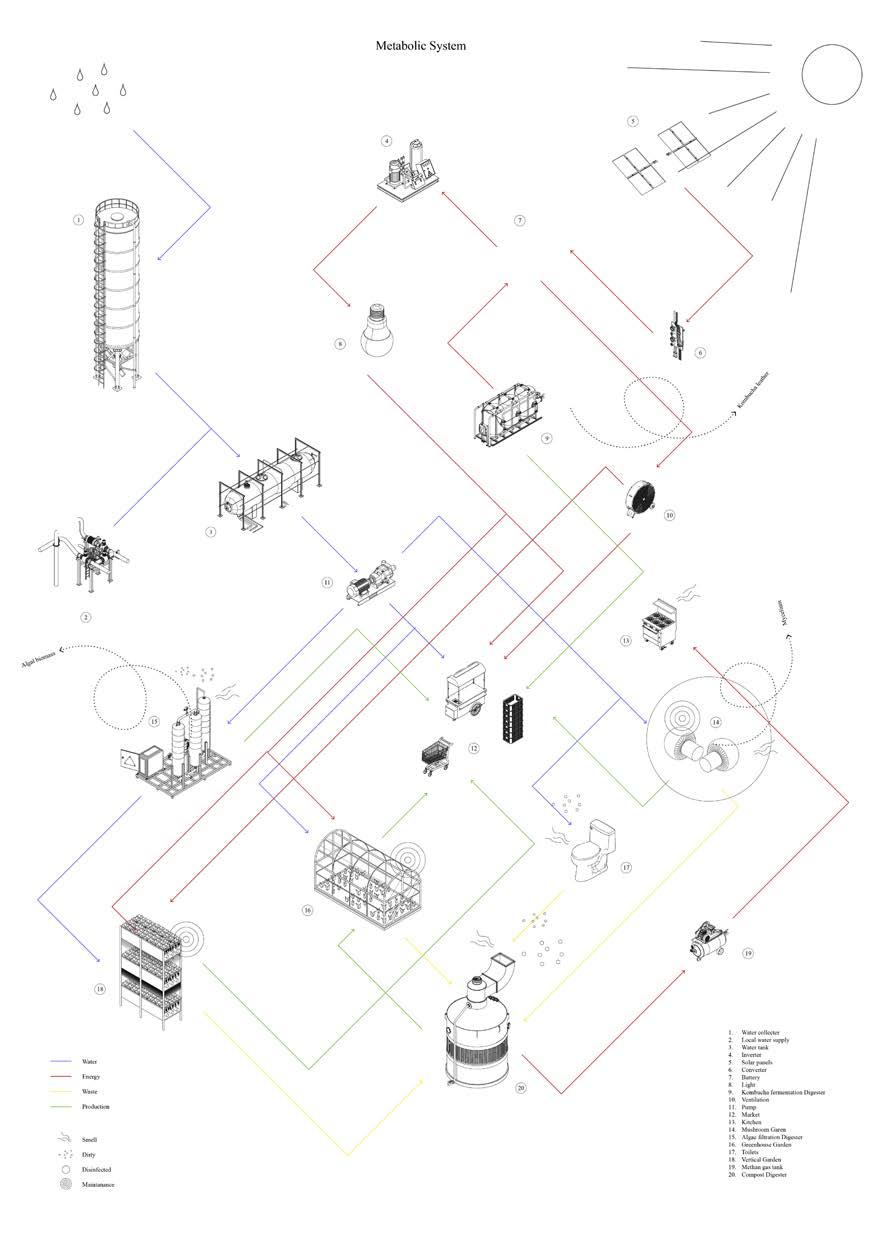 In this project, I will refer to the notion of metabolism to understand architecture as a body, an organism with its own digestion processes, literally and metaphorically. In this way, it can be possible to see new approaches to how food production, distribution, consumption, and decomposition, could be (re)organized and choreographed. The architecture in this project is designed to generate and recirculate resources through different symbiotic relations, like a living unity with materials and symbiotic processes.