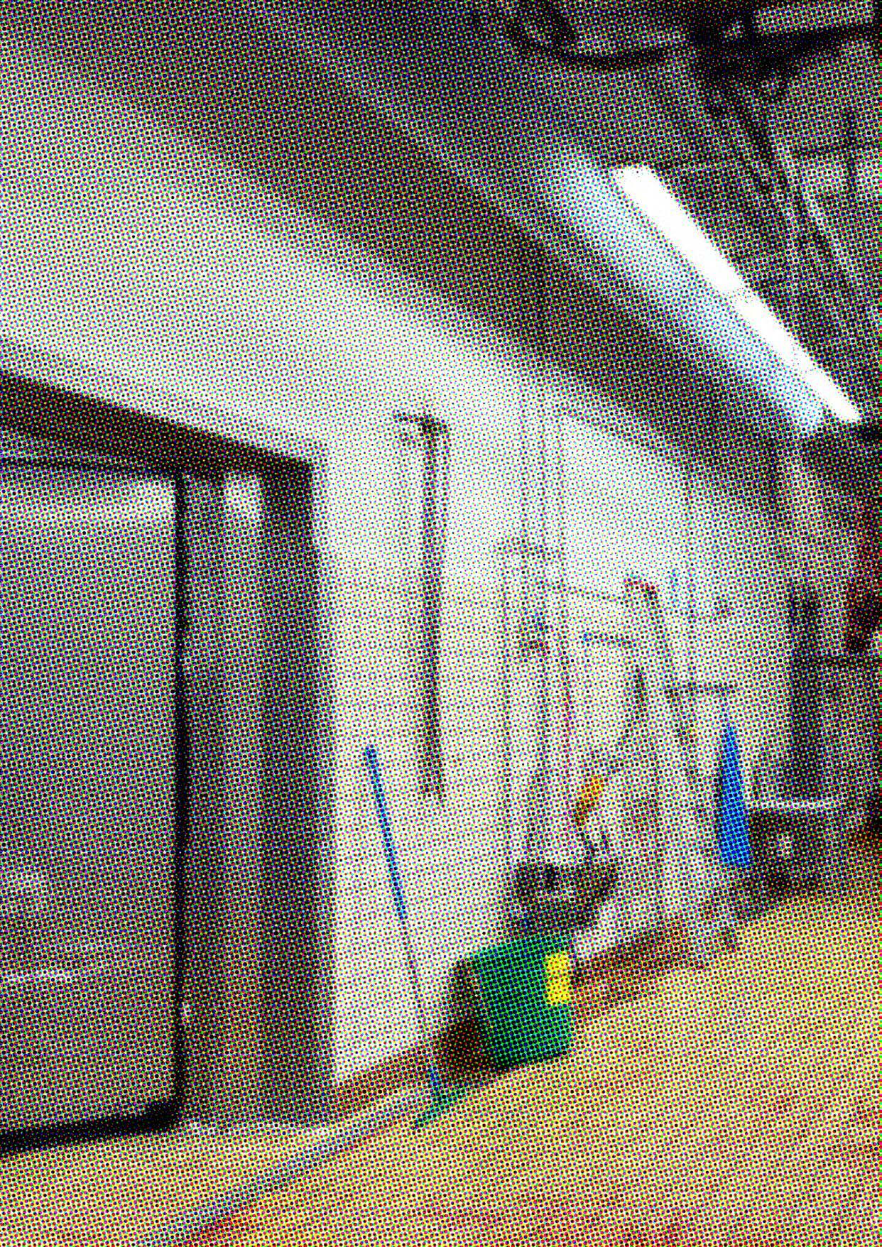 The architectural appearance of the transformation keeps the atmosphere of the historic Slaughterhouse in a collage of materialities. Most of the tanks are reused. Metal beams and panels have been reused from the industrial refurbishment of the old slaughterhouse. The beams have been reassembled to create new functional spaces such as digesters, new openings, roof structures, and the construction of new mycelium-insulated walls. The reused panels are reshaped by being curved and cramped since they are imperfect and have different dimensions. They are joined together to fit new specified placements, such as roof or protective panels in exposed areas such as by sinks and the kitchen. The hanging rail system is still present, but the carcasses are replaced with steel vessels, mushrooms, and plants. Connected to the rail system is the visual metabolic system, exposed by new piping leading the public throughout the building and its functions. Semitransparent curtains of scoby leather, reminiscent of those characteristics of slaughterhouses, and soft mycelium walls are organically shaped in contrast to the otherwise intricate appearance.