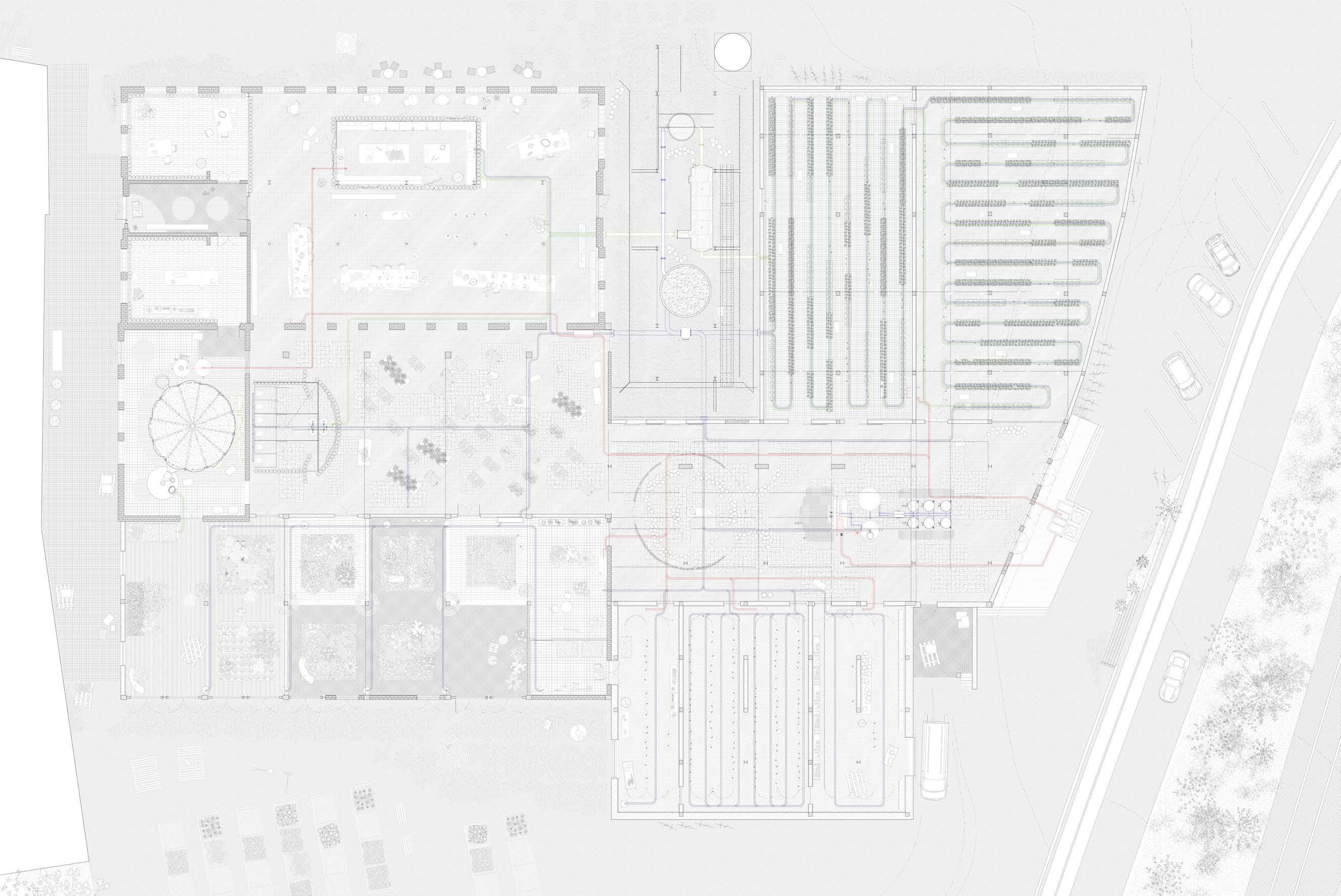With metabolism as an approach, the project focuses on the (re)organization of digestive processes and the design of their experiential and convivial qualities. In other words, an inclusive architecture that facilitates the creation of entanglements across multiple matters. In the metabolism drawing, these actors coexist by feeding each other in an entangled reciprocal subsistence system that doesn’t starve its surroundings.