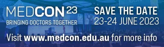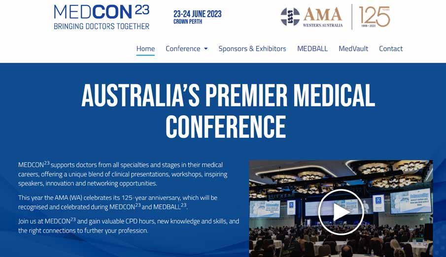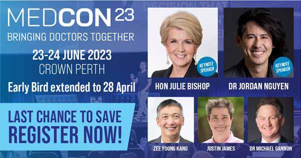 17 Exhibition Signage Double Page Ad Social Tile JOIN US AT AUSTRALIA’S LARGEST INTER-COLLEGE MEDICAL CONFERENCE CROWN PERTH 22-23 JULY 2022 MEDCON22 will have a line-up of amazing keynote speakers and expert presenters, headlining a range of inspiring and informative sessions, including discussions about CPD Homes and the new changes that will affect every doctor from 2023. Plus you can attend a range of collaborative clinical sessions presented by participating medical colleges. DIAMOND SPONSORS DR DANIEL NOUR 2022 Young Australian the Year Street Side Medics MICHAEL CROSSLAND Motivational Speaker PROF ANNE TONKIN Chair, Medical Board Australia DR VIJAY ROACH Chair, Council of Presidents of Medical Colleges PROF ROBYN LANGHAM Chair, Specalist Education Accreditation Committee, Australian Medical Council DR OMAR KHORSHID Federal AMA President PHIL BRITTEN Bali Bombing Survivor/Entrepreneur Register now at www.medcon.edu.au