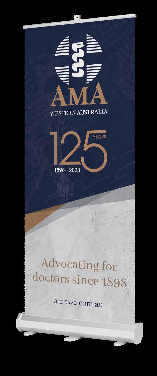 In 2023 the AMA (WA) celebrated it’s 125 Year Anniversary. Some of the items designed for this campaign included an anniversary logo, email signature, Medicus magazine cover, pull-up banner, and teardrop flag. The magazine timeline visually traces the organization’s impactful journey, collectively embodying a concise celebration of the AMA (WA)’s enduring commitment to healthcare excellence.