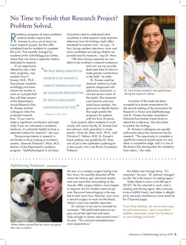 esidency programs at many academic of practice need to understand what medical centers require their constitutes a valid research study and then trainees to carry out at least one determine how the findings might affect major research project, but few offer standards for patient care,” he says. “In scheduled time for residents to complete fact, during resident interviews, more and the work. That recently changed for more candidates are asking whether we residents at the U-M Kellogg Eye Center, provide time for research,” says Dr. Mian. where they now have a separate rotation “We have always expected our residedicated to research. dents to be involved in research endeavors It’s an opportunity and now we can provide offered by only a few We have always expected our dedicated time for them to other programs, says make greater contributions resident Irina V. to the field,” he adds. residents to be involved in Koreen, M.D., Ph.D. Dr. Koreen used her Second-year residents research rotation to study research endeavors and now patients diagnosed with at Kellogg now have almost two months to sebaceous carcinoma, a we can provide dedicated time rare but serious tumor of work on a project that they will later present the eyelid. She reviewed for them to make greater at the Department’s case histories and anaannual Research Day. lyzed tissue samples. Her contributions to the field, Dr. Koreen and her goal was to identify factors colleagues value this that might predict the — Shahzad I. Mian, M.D. protected research prognosis for patients time. “If you want to with this form of cancer. make a significant contribution and espe Such projects allow residents to work cially if you are interested in academic closely with senior faculty. Dr. Koreen had medicine, it’s extremely helpful to have a two advisors, both specialists in oculoseparate rotation for research,” she says. plastics: Victor M. Elner, M.D., Ph.D., and The growing interest in research is Christine C. Nelson, M.D. Dr. Koreen’s not limited to those looking at academic tissue analysis was guided by Dr. Elner, careers, observes Shahzad I. Mian, M.D., one of just a few ophthalmic pathologists director of the Department’s residency in the country. He is the Ravitz Foundation program, “Ophthalmologists in all areas Professor.