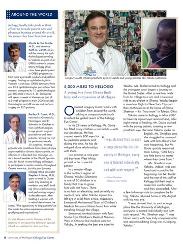 Yakubu, Ms. Shobe turned to Kellogg and the youngster soon began a journey to A young boy from Ghana finds the United States. After a one-hour walk from his village to a car and a two-hour help and compassion at Michigan ride to an airport in Ghana, Yakubu began a nine-hour flight to New York City and cularist Gregory Dootz works with then continued on to the home of Elaine children from around the world, Sheehan — his “host mom” in Toledo, Ohio. adding a compassionate touch Yakubu came to Kellogg in May 2007 to reflect the global reach of the Kellogg to have his injured eye removed and, after Eye Center. eight weeks of healing, Mr. Dootz worked In his 29 years at Kellogg, Mr. Dootz with the young patient, creating a new has fitted many children — and adults — with prosthetic eye. Because Yakubu spoke no eye prostheses. He has English, Ms. Sheehan says created nearly 800 eyes for she struggled to communiI was stunned that, in such cate with him about what his pediatric patients and, during this time, he has dewas happening, but Mr. veloped close relationships a large place like the Uni- Dootz quickly reassured with them. them noting, “Little boys Last summer a nine-yearversity of Michigan, every- are little boys no matter old boy from West Africa where they come from.” proved to be a special one is treated individually Ms. Sheehan says patient. Yakubu, indeed, was con In a remote village and with such respect. fused and scared in the in the northern region of beginning, but Mr. Dootz Ghana, Yakubu Sulemana — Elaine Sheehan and the rest of the staff at is one of 30 children in a Yakubu’s host mother Kellogg did their best to family that lives in grass make him comfortable, huts with dirt floors. There and they succeeded. After is no heat or electricity, and certainly no a few follow-up visits to complete the fitmedical care. After Yakubu injured his ting, Yakubu returned home in late August left eye in a fall from a tree, missionary with his new eye. Emmanuel Mohammed Tijani of Children’s “I was stunned that, in such a large Medical Missions Ghana found him while place like the University of Michigan, traveling through the village. everyone is treated individually and with Emmanuel worked closely with Tami such respect,” Ms. Sheehan says. “I was Shobe from Children’s Medical Missions blown away with how truly compassionate West in Ohio to find medical care for and accommodating Greg was in helping Yakubu. In seeking the best eye care for Yakubu.”