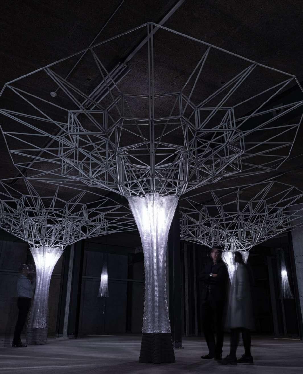 The pavilion features three long-span mushroom columns, each composed of a 3D-printed column and a radial spaceframe roof.
