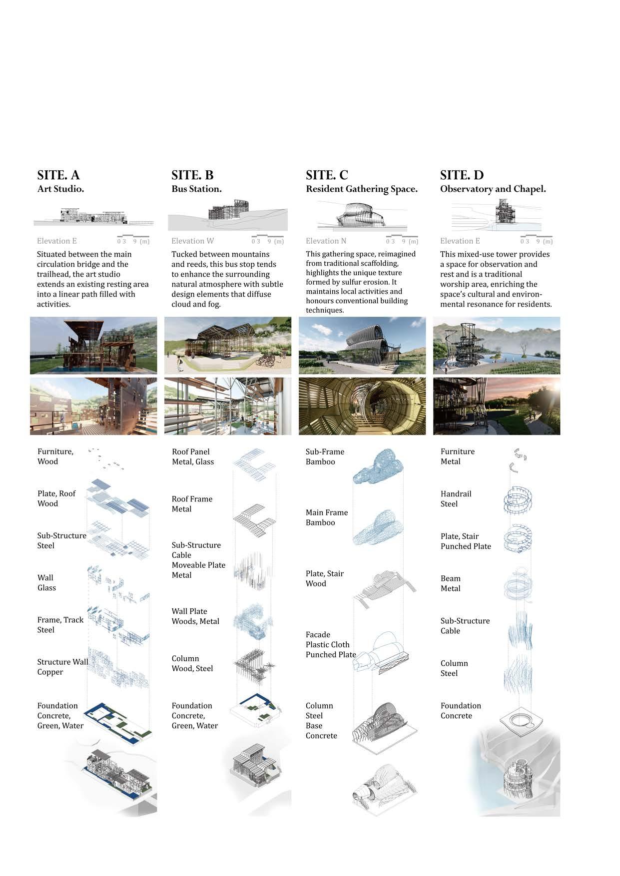 The final stage integrates these ideas into a series of architectural interventions along a path on Yangming Mountain. The route extends from a well-known tourist destination to a secluded mountain village. Along the way, pavilions serve as stopping points, offering spaces for both tourists and locals to pause and engage with the unique ambiance of each site. These pavilions act as reflective moments within a landscape rich in stories.