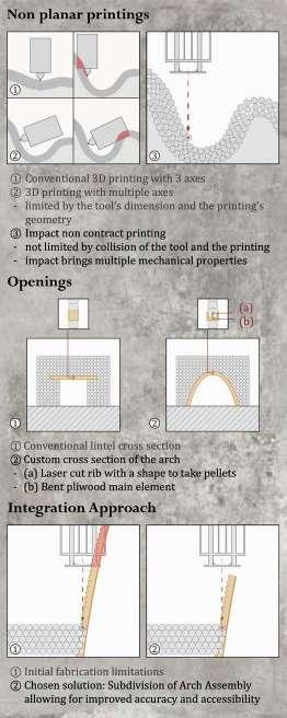 This thesis explores a horizontal 3D concrete printing (3DCP) method to reduce the negative impact. The proposed fabrication method, inspired by Nubian vaults, focuses on compression-only structures, slicing with inclined planes and using an angled end effector.