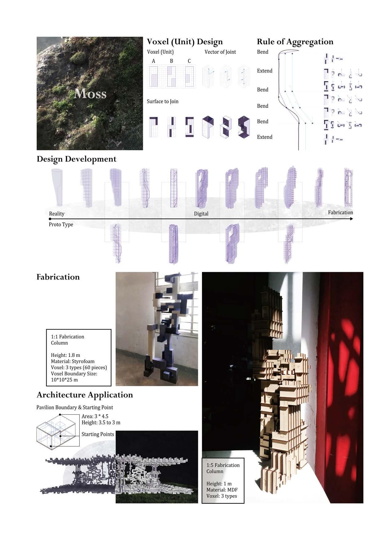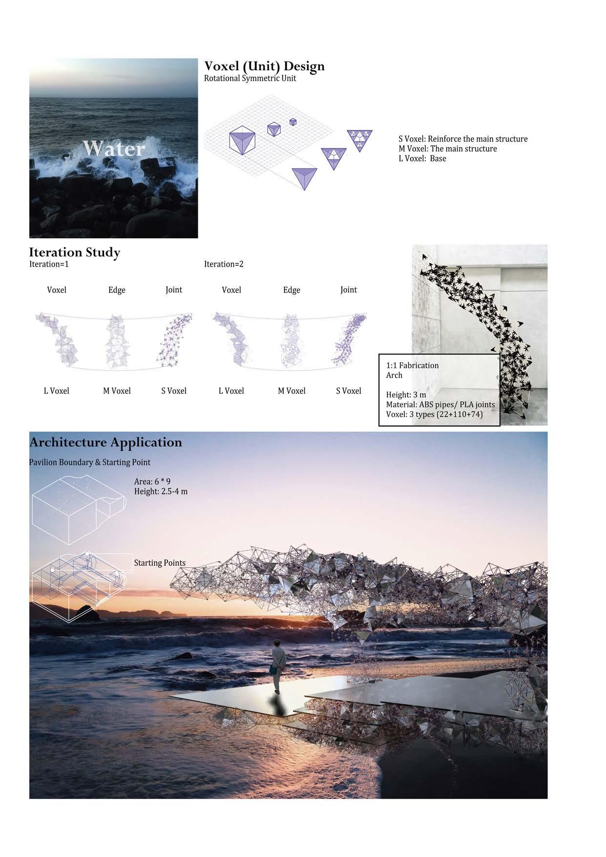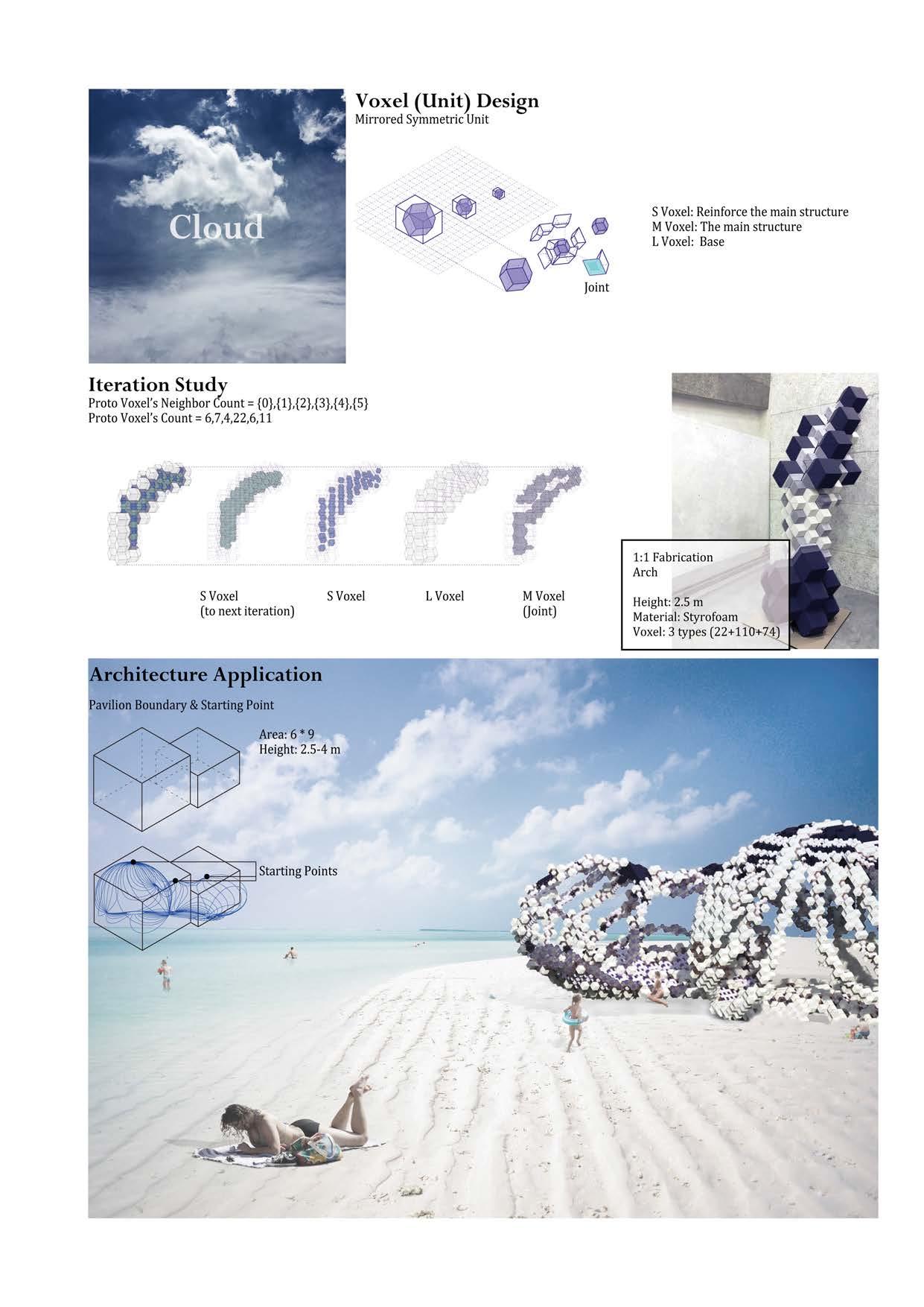 The focus is on how the geometric forms connect with neighboring units and how they iteratively aggregate as voxels, creating a complex system.