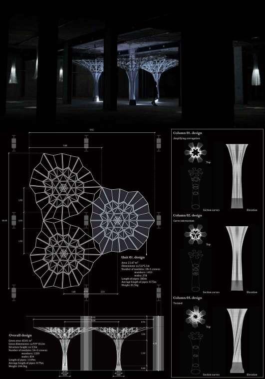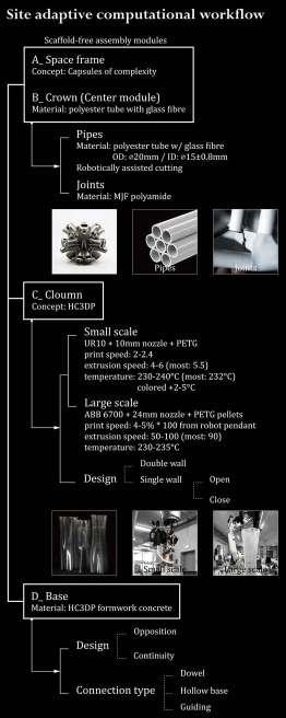 The roof structure, a spaceframe with an innovative topology, is enabled by 3D-printed interlocking connections. These connections allow the roof to interlock with each column via an intermediate module. The columns are manufactured with hollow-core 3D printing(HC3DP), designed to house post-tensioning cables and light sources within their hollow cores. Key design parameters for the columns include such as continuous toolpaths, maximum overhangs, and minimum feature sizes.