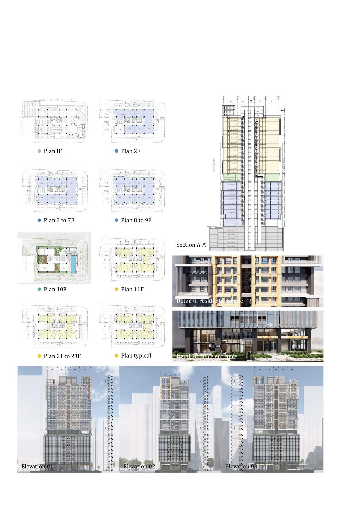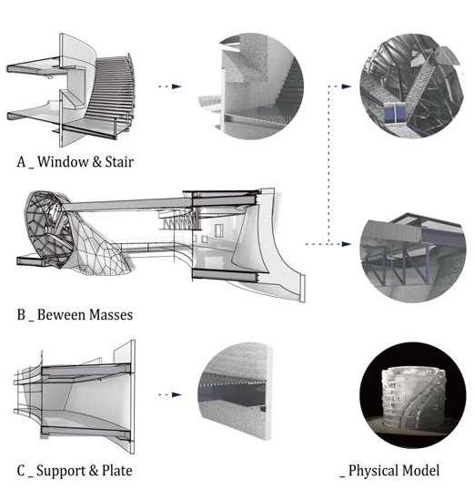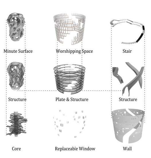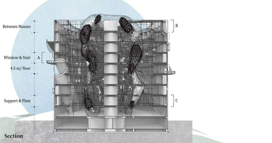 The primary structural elements are concrete walls throughout and a central metal core that hangs or supports other elements, such as floor slabs. Openings in the concrete, modular windows, and metal structures are parametrically designed.