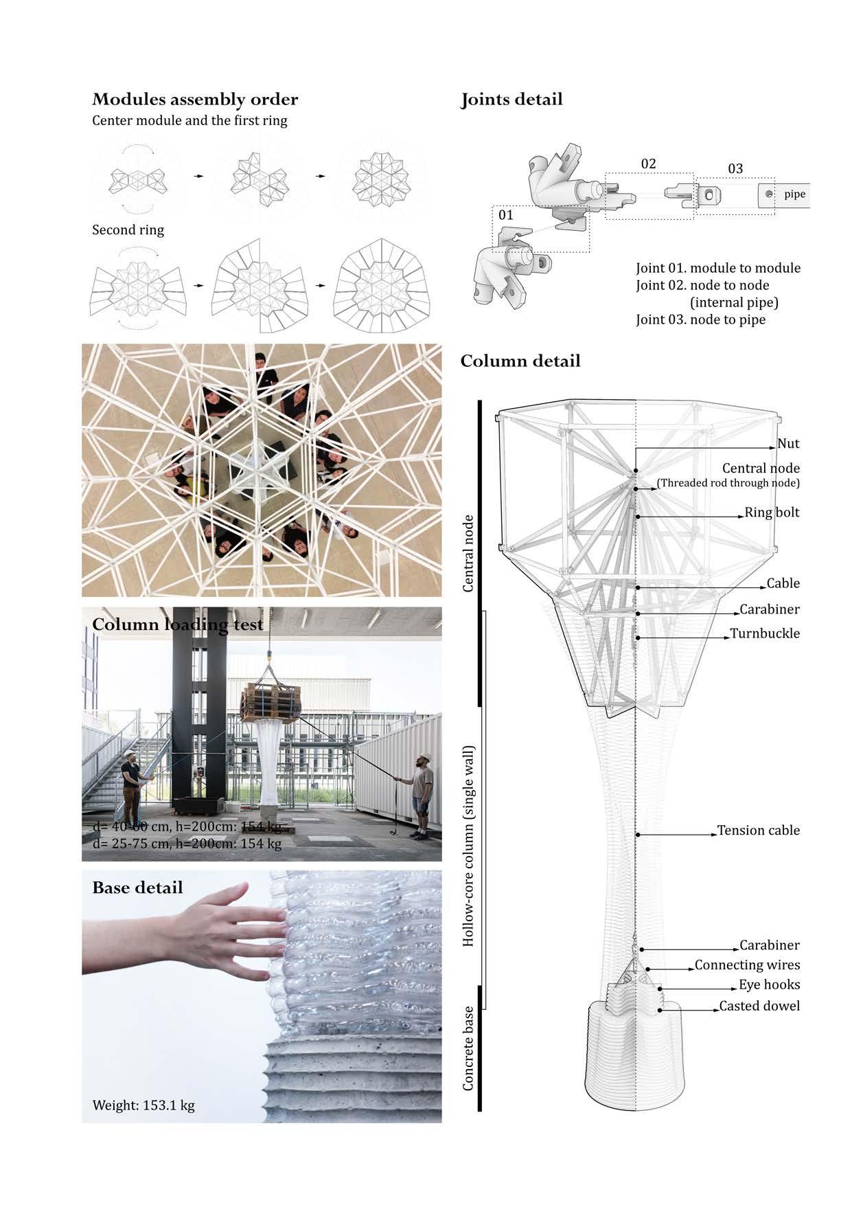 The spaceframe module's geometry is custom-fit for each column to interlock with the column's shape in its upper layers. A post-tensioning cable runs through the intermediate spaceframe module, through the column, and anchors at the concrete footings beneath. For spaceframe joints, a custom design tool calculates the minimum joint volume needed for each tube connection. This tool orients connection details, creating hybrid-detail joints uniquely tailored to their structural positions.