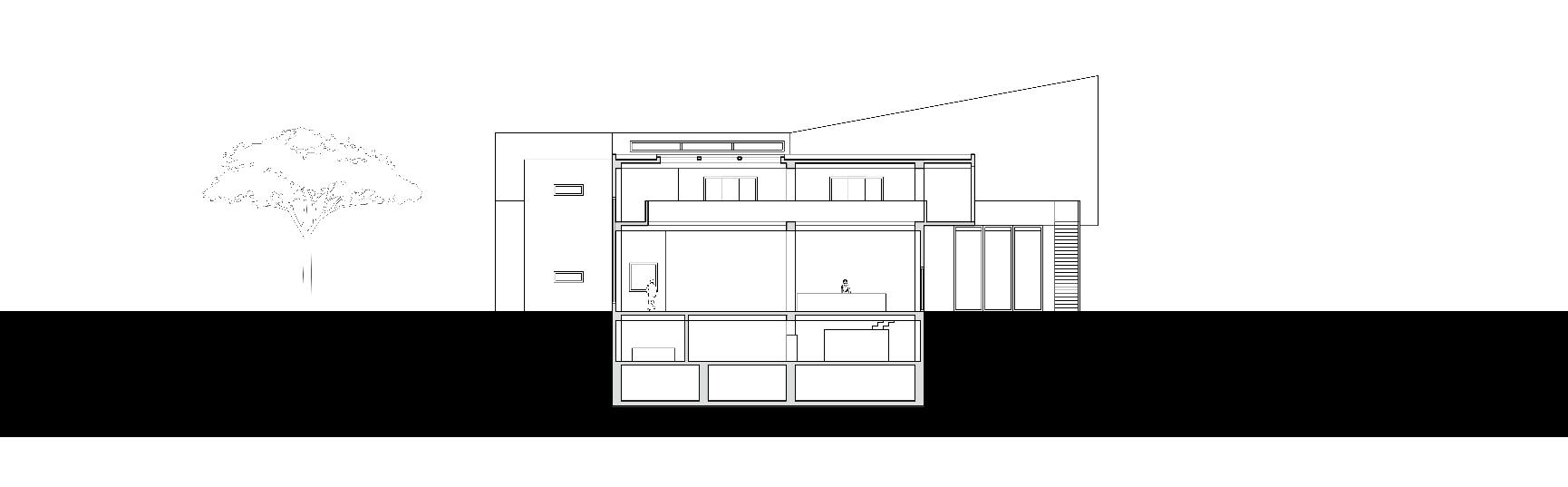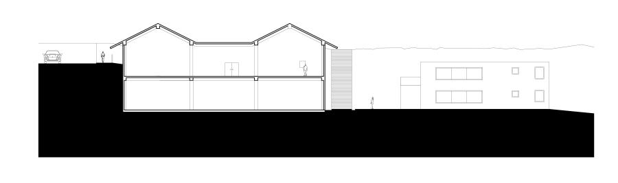 西南向立面 可看到祈禱室外觀 弧線造 型與眼形天窗 位在停車場上方 位置銜 接教堂與住宅之間