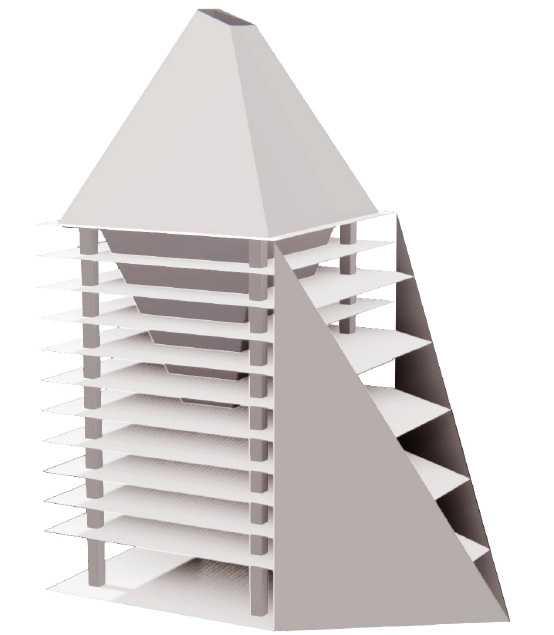 後來發展出錯開的弧形空間屋頂 及三辨弧形四分之一圓屋頂 再將大 的立面朝向綠空