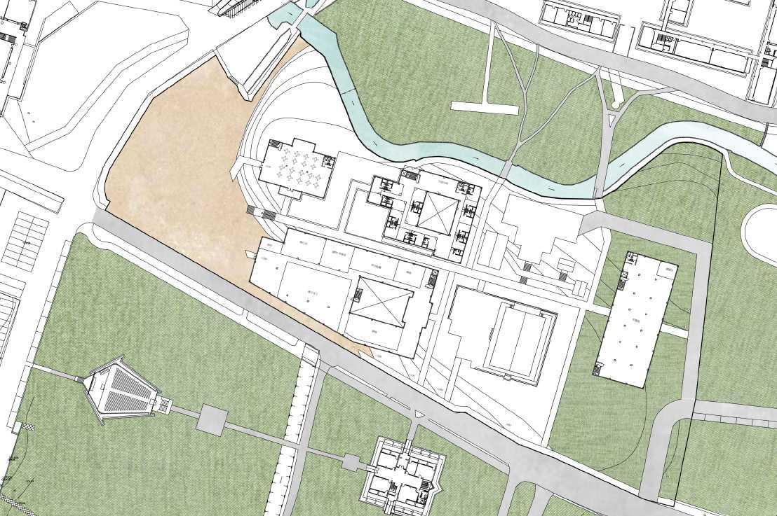 基地位於綠川河畔 操作神聖性空間形式的選擇 教會面對綠空廊道的立面