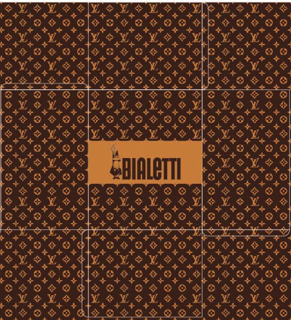 A try to integrate exclusive LV pattern with logo of Bialetti on it. A rectangle with contrasting color is added so that the bialetti logo is legible.