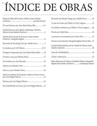 Playacar, Playa del Carmen, México, Jesús Sedeño Gutiérrez...................................................... portada interior El caza fortunas, por Ana María Romo Blas................. 3-4 Fachada barroca de la Iglesia Tepalcingo, Morelos, Mexico, Jesús Sedeño Gutiérrez......................................... 5 Tumba del Cementerio de Xcaret, Jesús Sedeño Gutiérrez -fotografia digital................................................ 6 Recuerdo de Nat King Cole, por Adolfo Escat................. 7