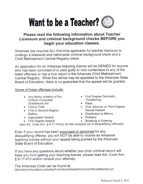 Receive a satisfactory Arkansas State Police and FBI Background Check and the Arkansas Child Maltreatment Background Check (Arkansas Department of Elementary and Secondary Education requirements).