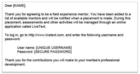 UAFS uses a web-based software program to collect information from our mentor teachers. When we enter your information into this software, LiveText, an email will be sent to you with your username and password. Please keep this username and password. You will use it each time you are assigned a Practicum student or Intern from UAFS.