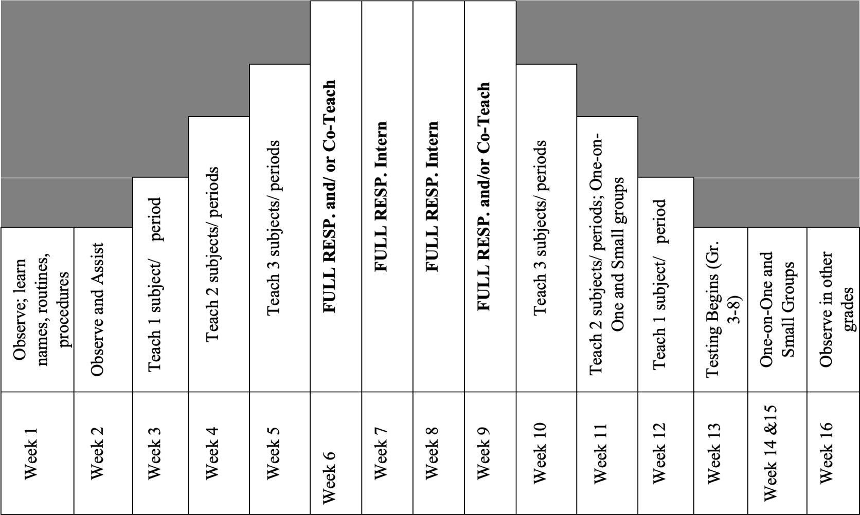 • Keep in mind that interns need at least 2 weeks of full responsibility (2 weeks can be co-teaching experiences with mentor teacher), and that they should spend their first and last weeks of the internship co-teaching.