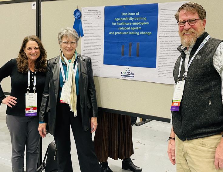 Dr. Barbara Lester (center) presenting her research at the 2024 GSA Scientific Meeting of along with her Capstone committee members, Drs. Nicole Ruggiano (left), and Troy Anderson (Univ. of Utah, right).