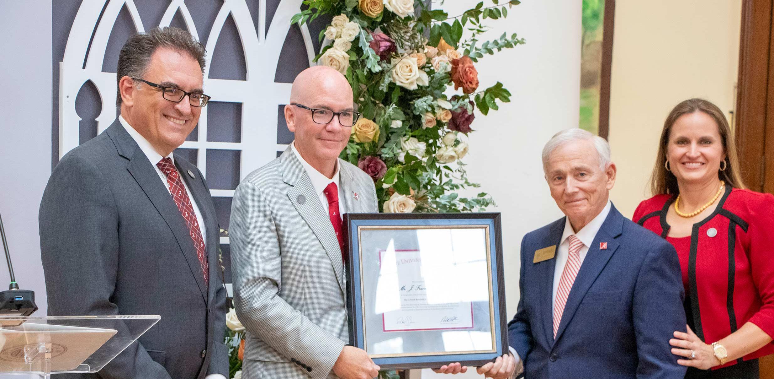 On Sept. 5, faculty, staff and friends of the J. Frank Barefield Jr. College of Arts & Sciences gathered to commemorate Barefield’s historic gift. President Peter Mohler and Dean Joseph Messina addressed the College and presented Barefield and his wife Barbi Breimann with a certificate celebrating the commitment.
