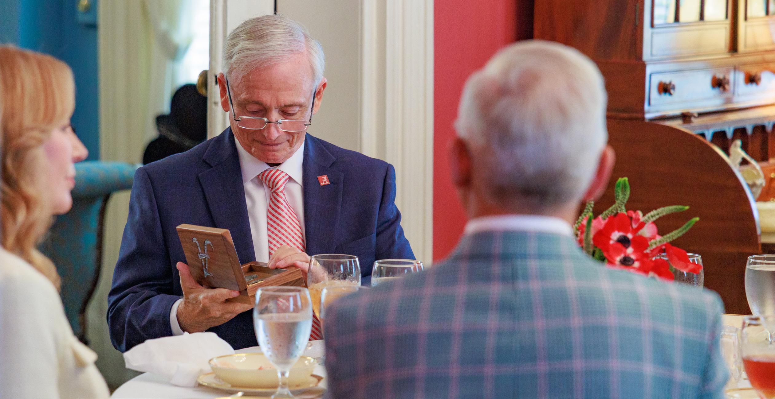 J.FrankBarefieldJr.metwithPresident PeterMohlerandDeanJosephMessinaat thePresident’sMansiontocelebratehisgift totheCollege.
