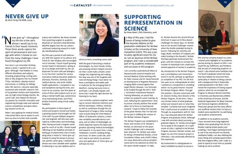 ever give up”—throughout my life this is the catch phrase I would say to my friends in their lowest moments. These three words capture the spirit of perseverance and courage with which I choose to confront the many challenges I have faced throughout my life. Ever since I can remember thinking about a career, I wanted to be a surgeon. Although I had hobbies in many different disciplines and subjects, including programming, writing websites or silly programs into my friends’ TI-83+ calculators, playing musical instruments, or trolling my siblings (also CBC alumni), I became especially enamored with scientific research. One of my greatest mentors and inspirations was my high school biology teacher, Ms. Laurie Cale, who helped me discover my passion for scientific innovation and engineering through state and national science competitions and gene-silencing research at the UA. When I was applying for medical school, I discovered there was an option to combine my drive to further both scientific Alice with siblings Shiana and Jonathan