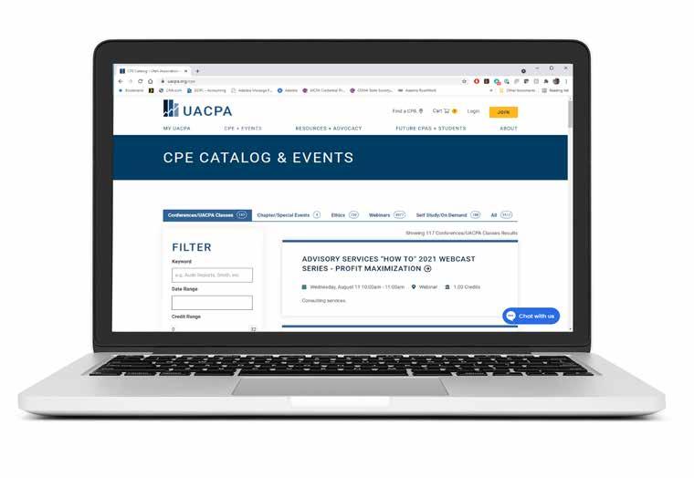 Simplify your search for quality CPE. Our “CPE + Events” catalog, accessible directly from the homepage, offers thousands of courses designed to meet your professional development needs. If you don’t immediately see what you’re after, our UACPA team is ready to assist you via chat.