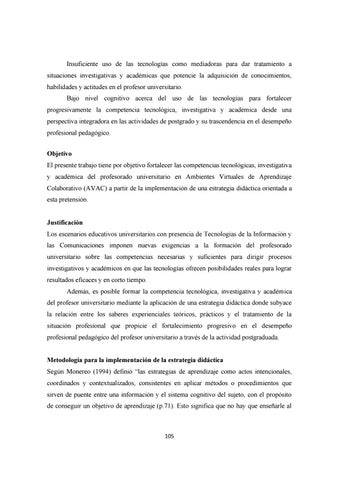 Justificación Los escenarios educativos universitarios con presencia de Tecnologías de la Información y las Comunicaciones imponen nuevas exigencias a la formación del profesorado universitario sobre las competencias necesarias y suficientes para dirigir procesos investigativos y académicos en que las tecnologías ofrecen posibilidades reales para lograr resultados eficaces y en corto tiempo. Además, es posible formar la competencia tecnológica, investigativa y académica del profesor universitario mediante la aplicación de una estrategia didáctica donde subyace la relación entre los saberes experienciales teóricos, prácticos y el tratamiento de la situación profesional que propicie el fortalecimiento progresivo en el desempeño profesional pedagógico del profesor universitario a través de la actividad postgraduada.