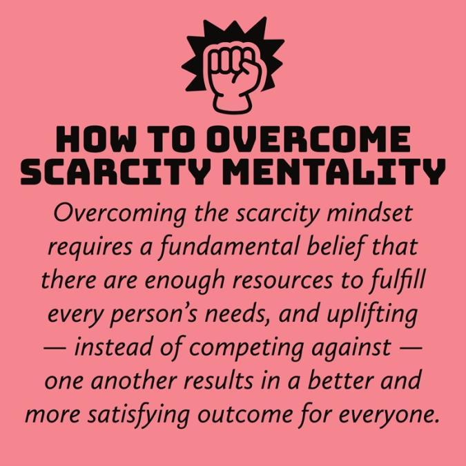 Scarcitymentalityistheidea thateveryoneexistswithinaspectrum ofcompetition.Thismentalityassumes therearefiniteresources (tangible and intangible),andthatevery resourceobtainedbyonepersonor groupcomes at the expense ofanother. Therefore,weneedtokeepresources forourselvesorreservethemfor peopleinourclosestcircle(s).