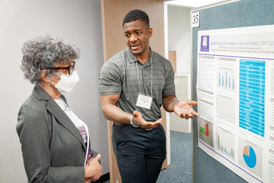 MPH student KennethOkonkwodiscussesfindings fromhisposter withNew York State Commissioner of Health,Dr MaryBassett at the Annual SPH Student Poster Dayheldinthe George EducationCenter at the HealthSciencesCampus