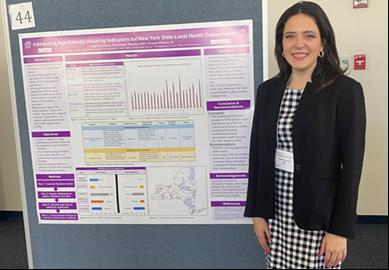 Abigail Guisbondposeswithher poster Addressing Age FriendlyHousing Indicatorsfor NewYork State'sLocal HealthDepartmentsat the UAlbany School of PublicHealth's31st Annual Student Poster DayinApril 2022. She receivedthe highest honor,the Excellence inScholarshipAwardfrom the HealthPolicy&Management department,inrecognitionfor her outstanding poster presentation.