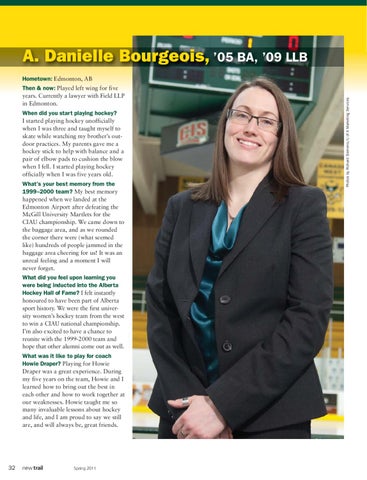 A. Danielle Bourgeois, ’05 BA, ’09 LLB Then & now: Played left wing for five years. Currently a lawyer with Field LLP in Edmonton. When did you start playing hockey? I started playing hockey unofficially when I was three and taught myself to skate while watching my brother’s outdoor practices. My parents gave me a hockey stick to help with balance and a pair of elbow pads to cushion the blow when I fell. I started playing hockey officially when I was five years old. What’s your best memory from the 1999–2000 team? My best memory happened when we landed at the Edmonton Airport after defeating the McGill University Martlets for the CIAU championship. We came down to the baggage area, and as we rounded the corner there were (what seemed like) hundreds of people jammed in the baggage area cheering for us! It was an unreal feeling and a moment I will never forget. What did you feel upon learning you were being inducted into the Alberta Hockey Hall of Fame? I felt instantly honoured to have been part of Alberta sport history. We were the first university women’s hockey team from the west to win a CIAU national championship. I’m also excited to have a chance to reunite with the 1999-2000 team and hope that other alumni come out as well. What was it like to play for coach Howie Draper? Playing for Howie Draper was a great experience. During my five years on the team, Howie and I learned how to bring out the best in each other and how to work together at our weaknesses. Howie taught me so many invaluable lessons about hockey and life, and I am proud to say we still are, and will always be, great friends.