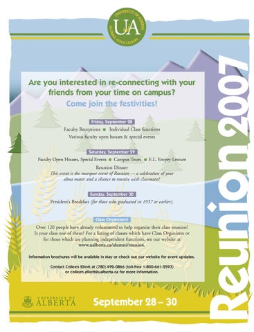 Over 120 people have already volunteered to help organize their class reunion! Is your class one of them? For a listing of classes which have Class Organizers or for those which are planning independent functions, see our website at www.ualberta.ca/alumni/reunion. Information brochures will be available in May or check out our website for event updates. Contact Colleen Elliott at (780) 492-0866 (toll-free 1-800-661-2593) or colleen.elliott@ualberta.ca for more information.