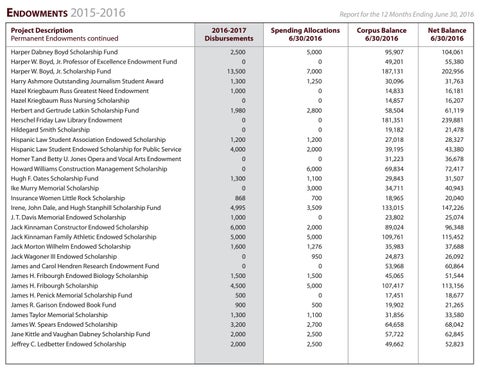 Project Description Permanent Endowments continued Harper Dabney Boyd Scholarship Fund Harper W. Boyd, Jr. Professor of Excellence Endowment Fund Harper W. Boyd, Jr. Scholarship Fund Harry Ashmore Outstanding Journalism Student Award Hazel Kriegbaum Russ Greatest Need Endowment Hazel Kriegbaum Russ Nursing Scholarship Herbert and Gertrude Latkin Scholarship Fund Herschel Friday Law Library Endowment Hildegard Smith Scholarship Hispanic Law Student Association Endowed Scholarship Hispanic Law Student Endowed Scholarship for Public Service Homer T.and Betty U. Jones Opera and Vocal Arts Endowment Howard Williams Construction Management Scholarship Hugh F. Oates Scholarship Fund Ike Murry Memorial Scholarship Insurance Women Little Rock Scholarship Irene, John Dale, and Hugh Stanphill Scholarship Fund J. T. Davis Memorial Endowed Scholarship Jack Kinnaman Constructor Endowed Scholarship Jack Kinnaman Family Athletic Endowed Scholarship Jack Morton Wilhelm Endowed Scholarship Jack Wagoner III Endowed Scholarship James and Carol Hendren Research Endowment Fund James H. Fribourgh Endowed Biology Scholarship James H. Fribourgh Scholarship James H. Penick Memorial Scholarship Fund James R. Garison Endowed Book Fund James Taylor Memorial Scholarship James W. Spears Endowed Scholarship Jane Kittle and Vaughan Dabney Scholarship Fund Jeffrey C. Ledbetter Endowed Scholarship