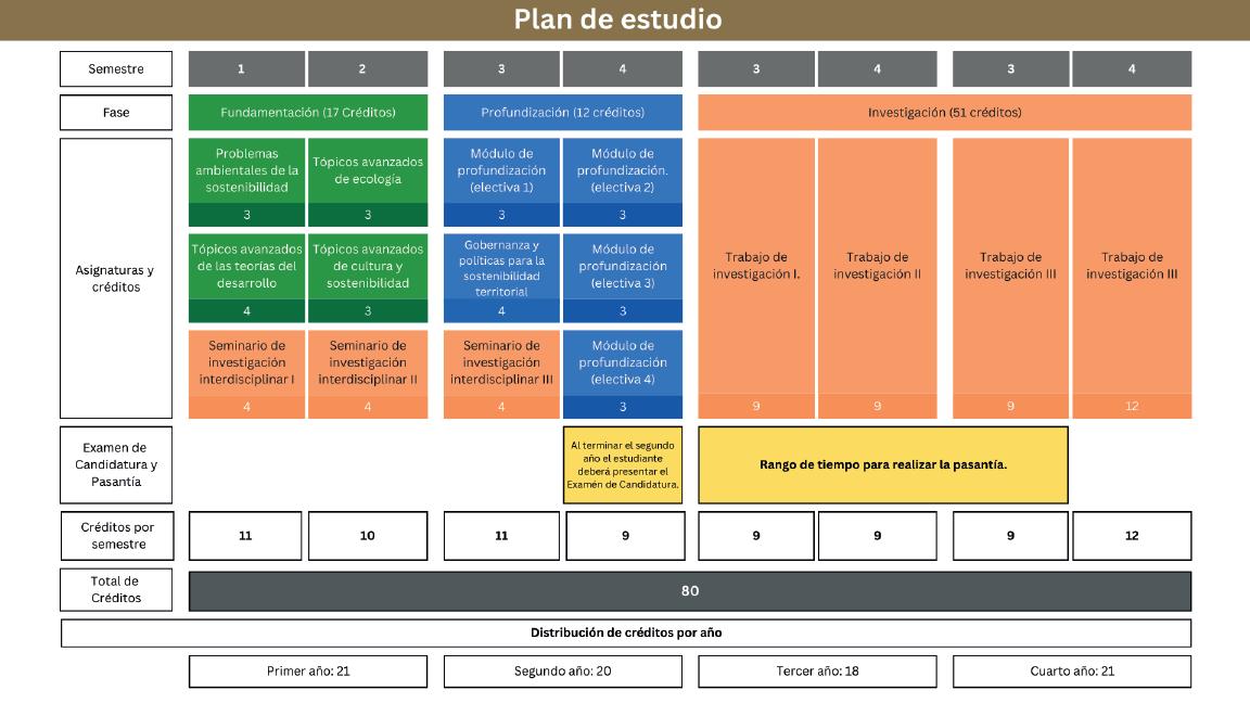 El programa es de carácter inter, multi y transdisciplinar, con 80 créditos distribuidos en cuatro años (ocho semestres).