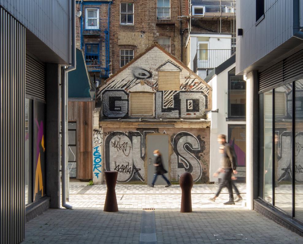 Alex Chinneck’s ambitious new sculpture, ‘A Spring in Your Step’, explodes over Circus Street’s central courtyard, a stone’s throw from a huge mural of stampeding horses by Brighton-based street artist AROE, and the entrances to the scheme are adorned with sculptural bollards, the brainchild of the internationally-acclaimed Antony Gormley, a former teacher at Brighton College of Art.