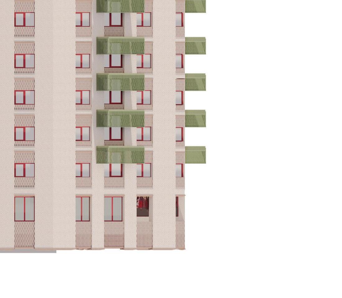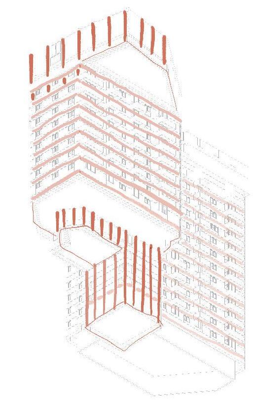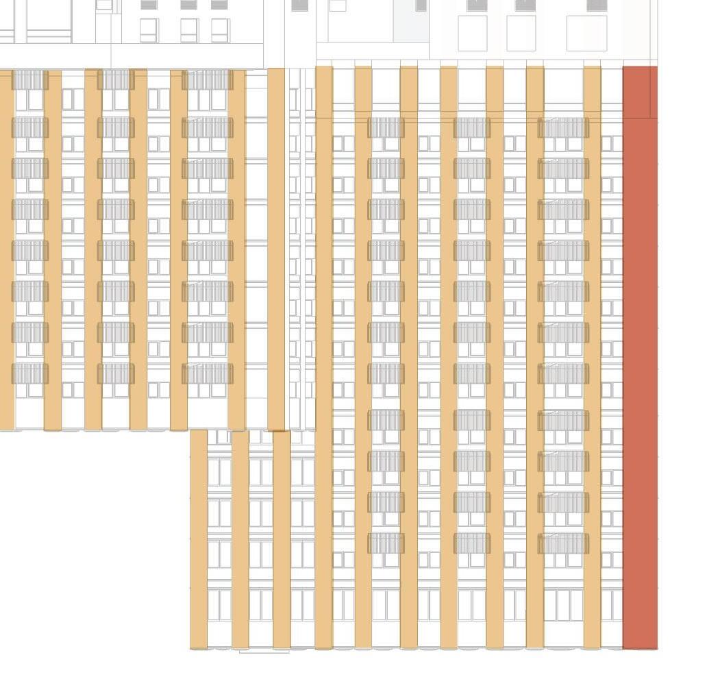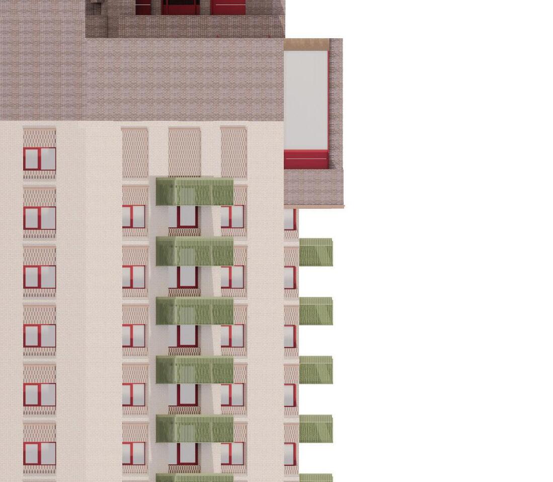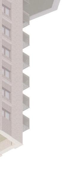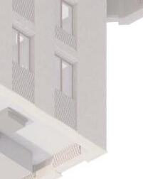 -We have extended the vertical piers up to the parapet to form a more cohesive crown. The portal openings to the roof terrace and plant areas align with the windows below, maintaining a consistent vertical expression throughout the entire structure.
