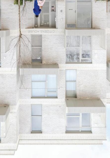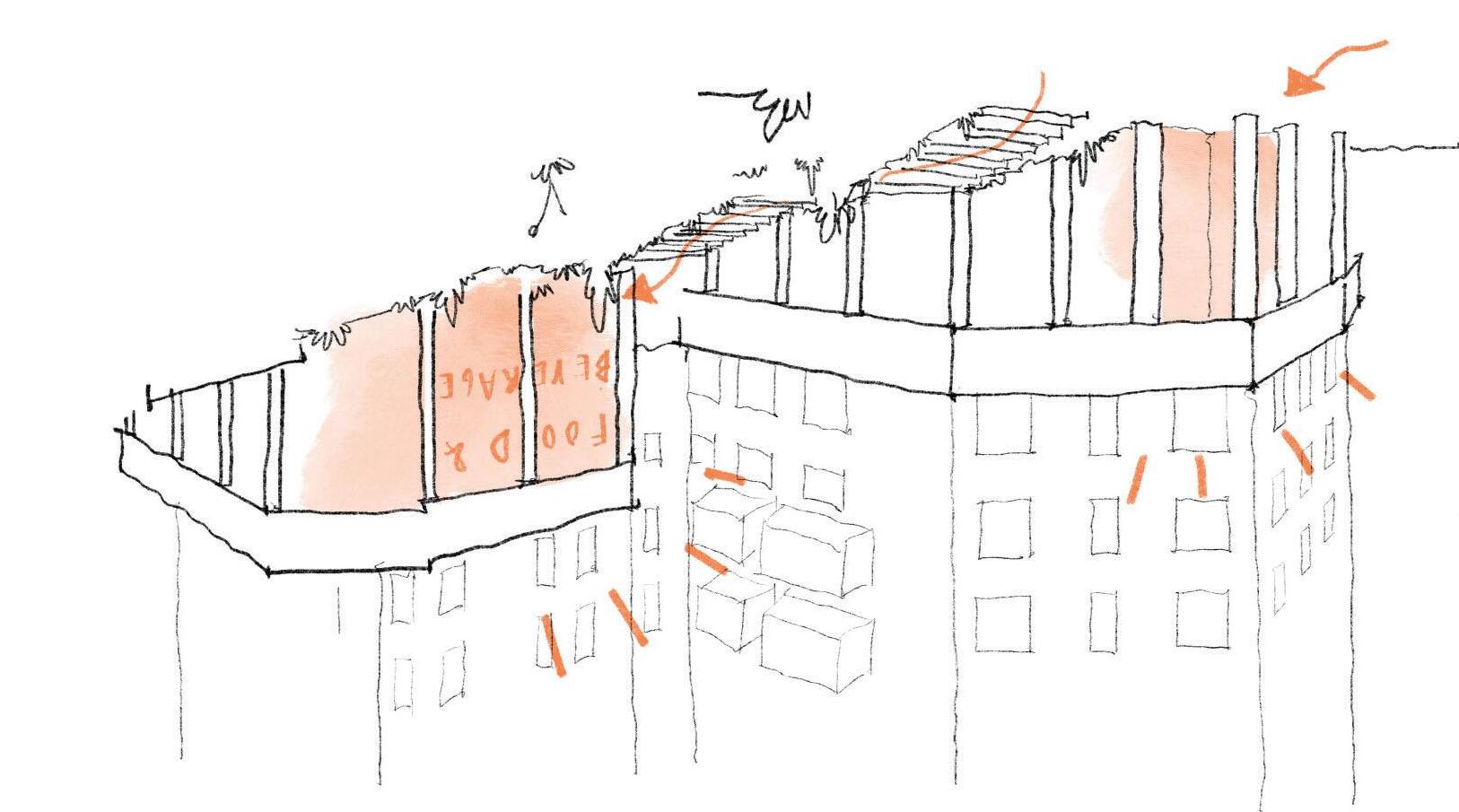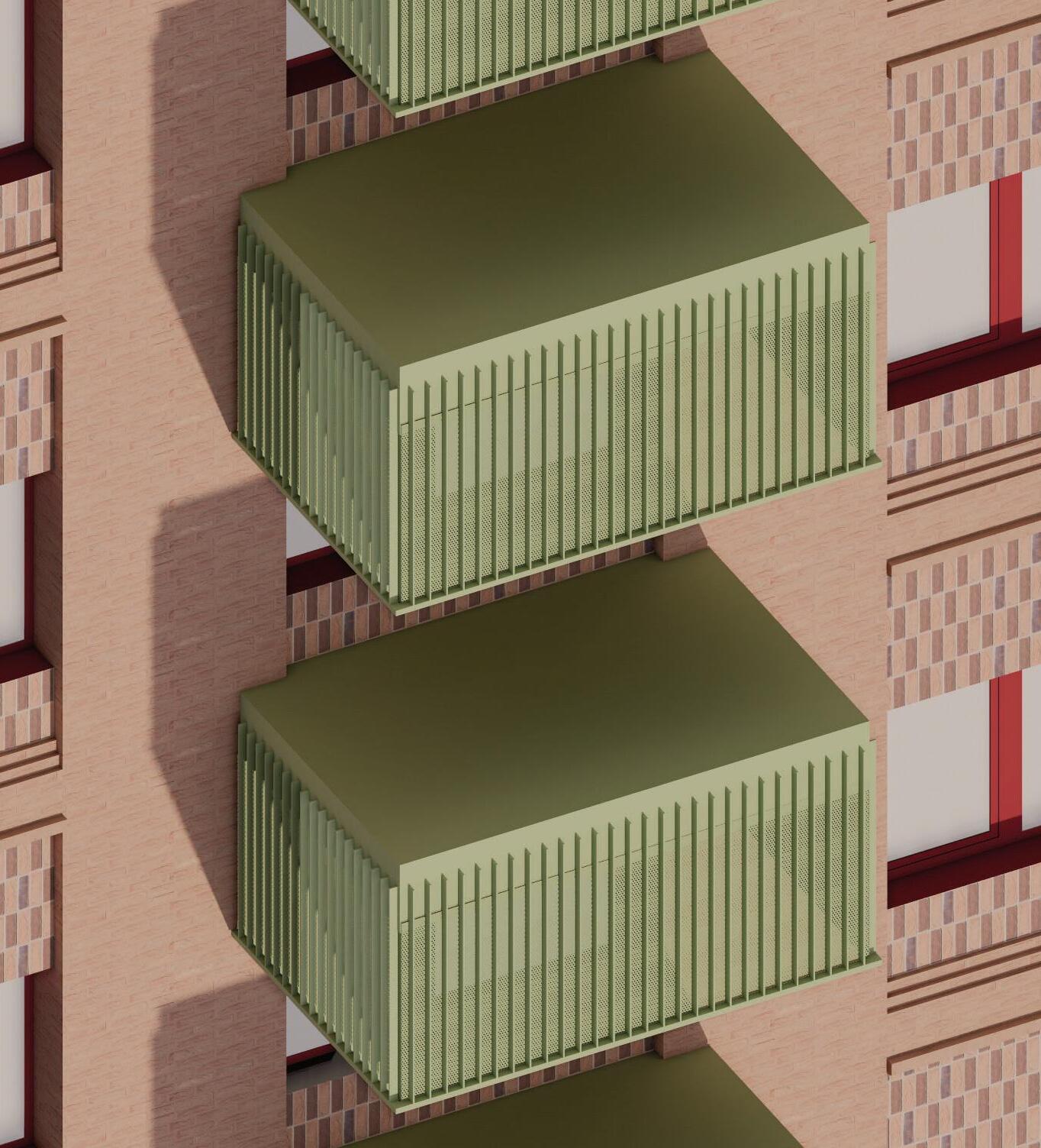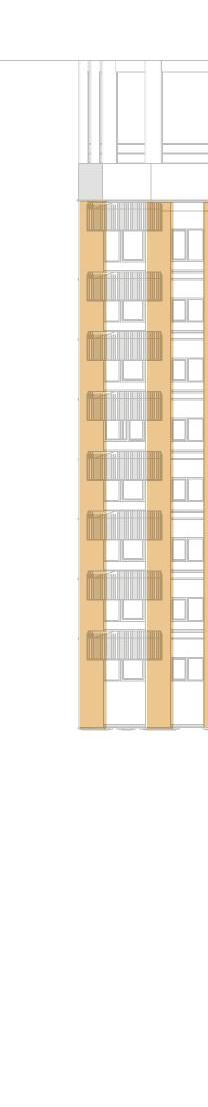 -We have extended the vertical piers up to the parapet to form a more cohesive crown. The portal openings to the roof terrace and plant areas align with the windows below, maintaining a consistent vertical expression throughout the entire structure.
