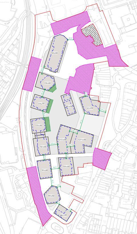 The areas hatched in pink/purple are the detailed application zone, all other areas and plots within the redline boundary are included within the outline planning application.